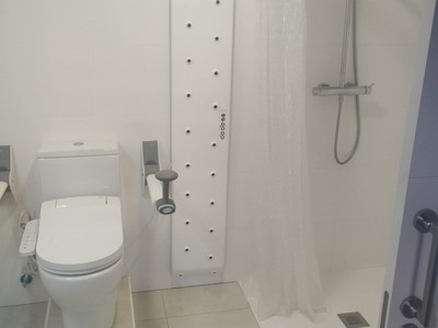 El piso cuenta con tres amplias habitaciones y dos baños completamente adaptados para personas con movilidad reducida, garantizando funcionalidad y comodidad. Dispone de un luminoso salón, cocina independiente totalmente equipada y una magnífica terraza de 20 m², ideal para disfrutar del aire libre.